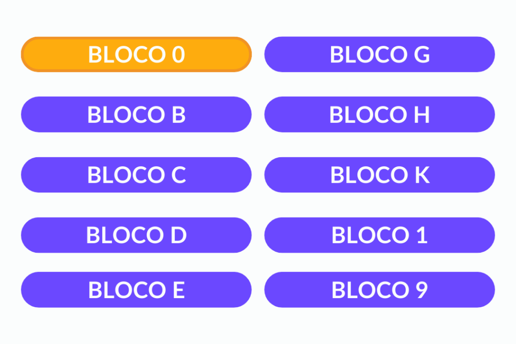 Os blocos são organizados e dispostos em sequência, sendo iniciado pelo Bloco 0 – Abertura, Identificação e Referências.