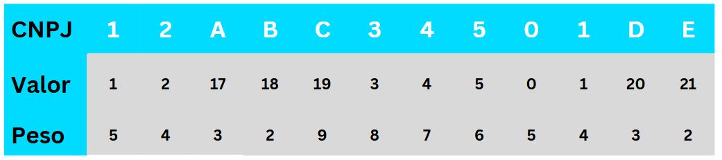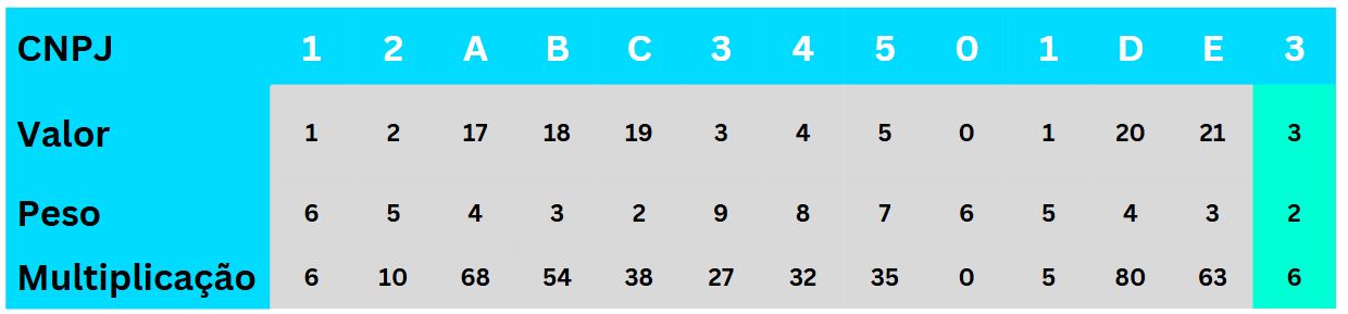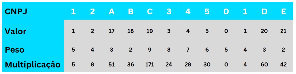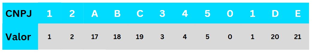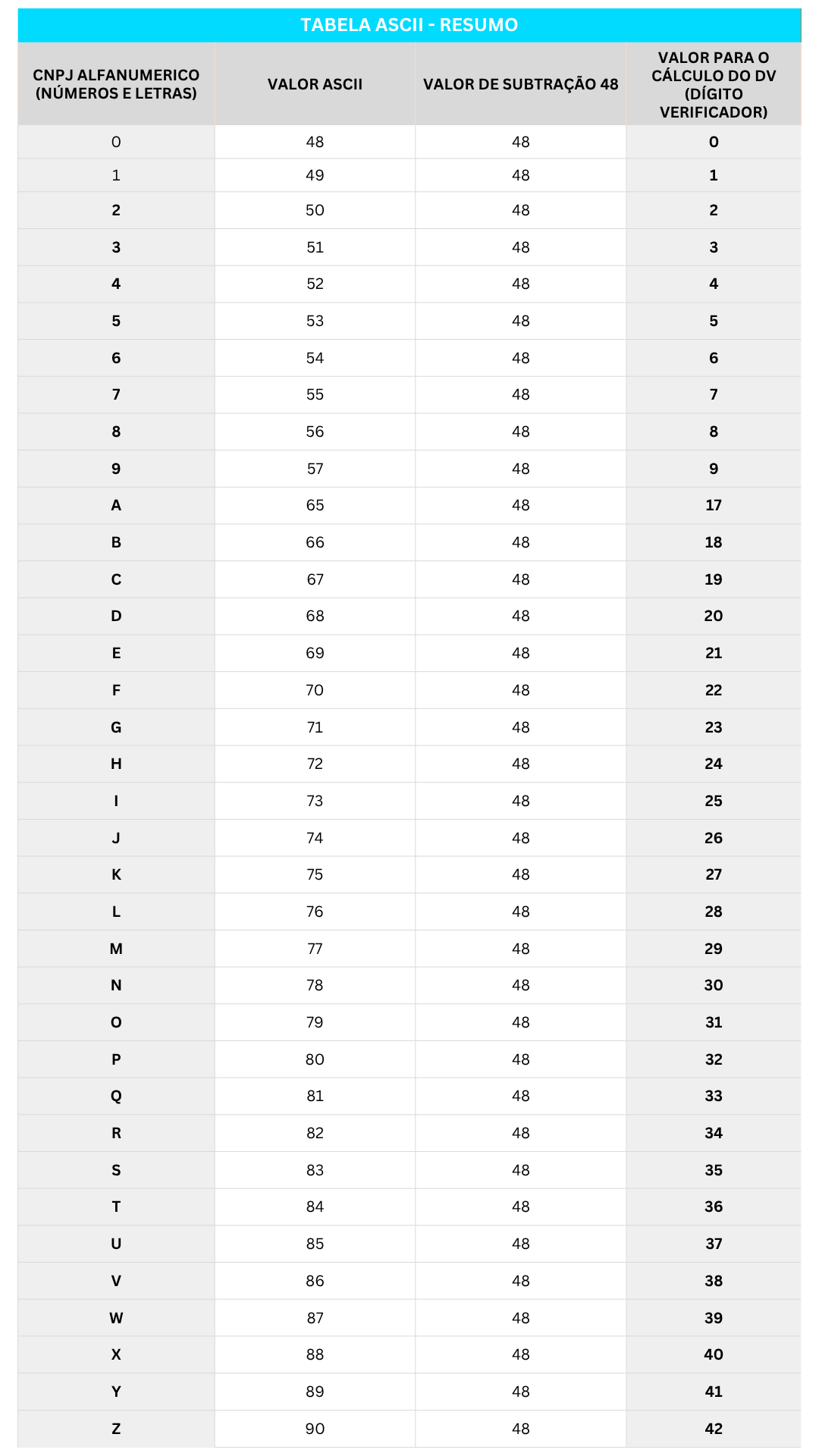 Para cada um dos caracteres do CNPJ numérico, será atribuído o valor da coluna “Valor para cálculo do DV”, conforme a tabela abaixo (ou subtrair 48 do “Valor ASCII”).