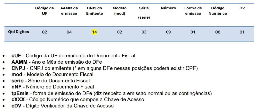 A Estrutura da chave de acesso (44 posições): UF + AAMM + CNPJ + modelo + série + número + tipo emissão + código numérico + DV.