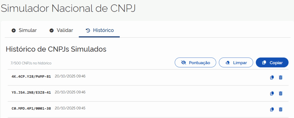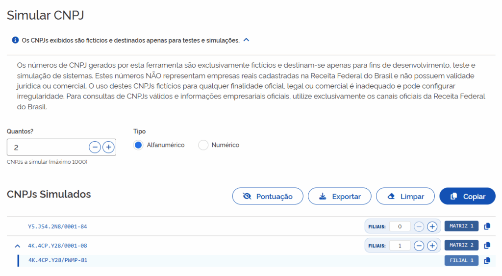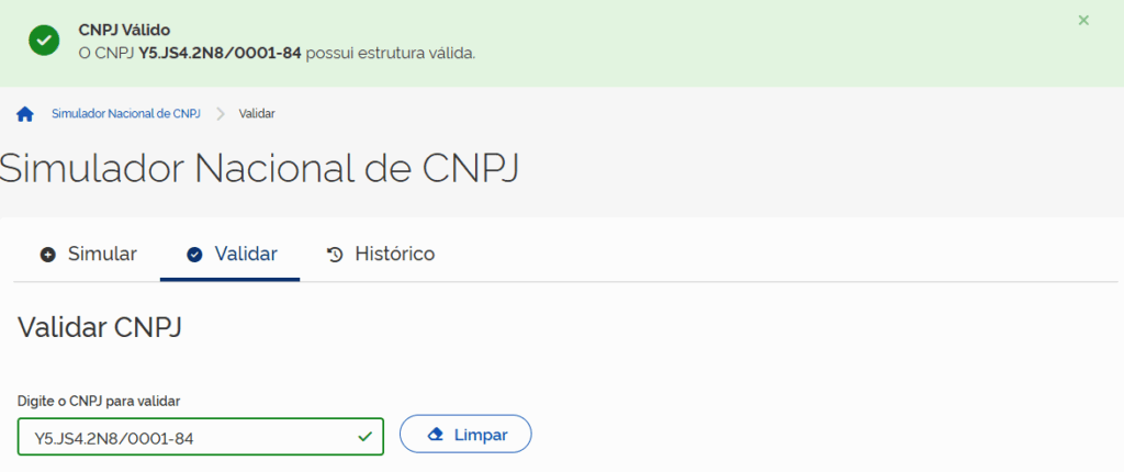 Por meio do novo simulador é possível simular (com ou sem pontuação), validar e exportar em txt os CNPJs com a estrutura alfanumérica de matrizes e filiais.