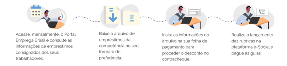 2. Consulta Mensal: Acessar o Portal Emprega Brasil, na opção “Consignado para Todos”, para baixar o “Arquivo de Empréstimos”, que contém a relação dos empregados e os valores a serem descontados na folha de pagamento.