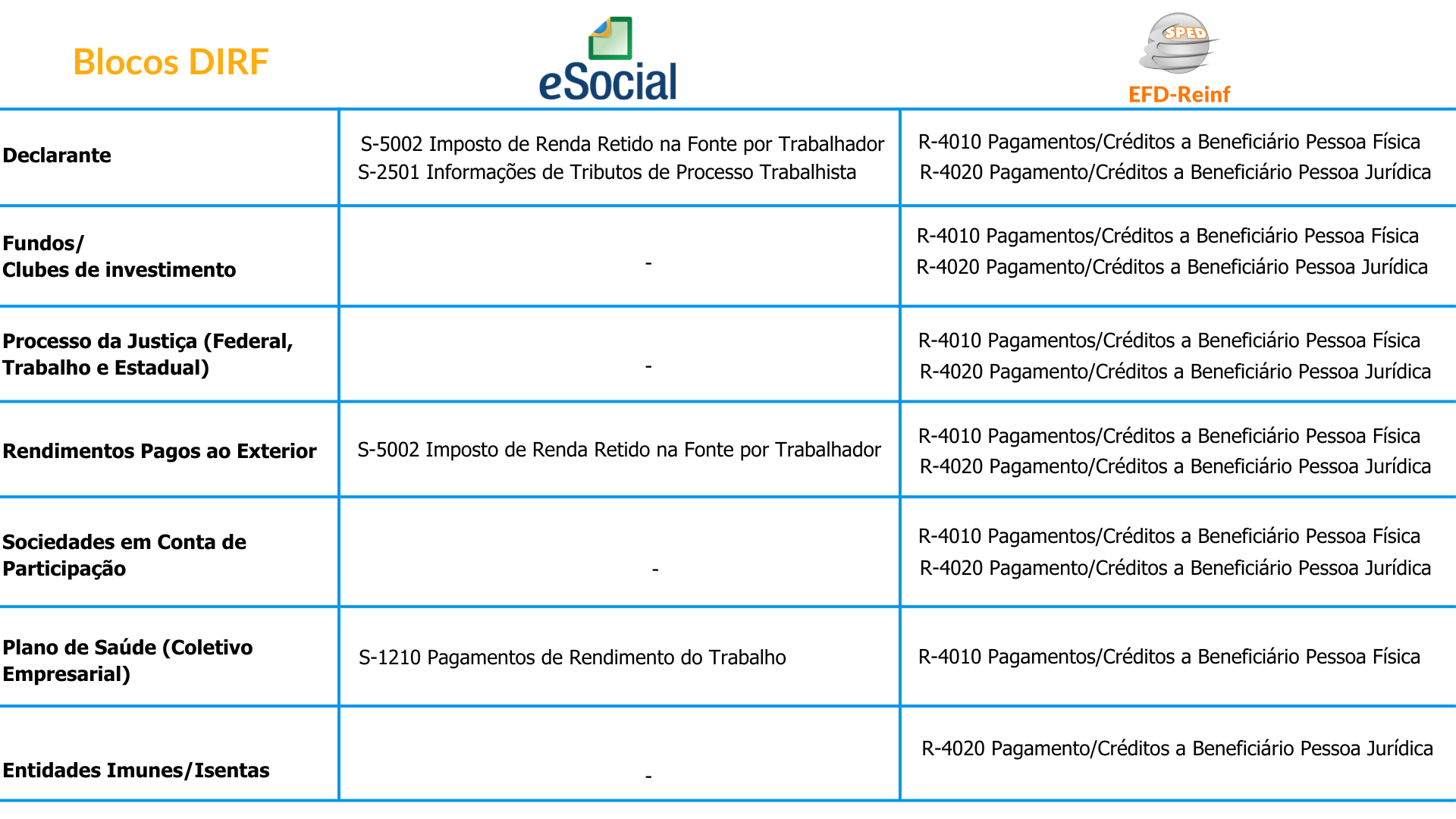 - A principal evolução da DIRF nos últimos anos foi a integração com o eSocial (Sistema de Escrituração Digital das Obrigações Fiscais, Previdenciárias e Trabalhistas) e a EFD-Reinf (Escrituração Fiscal Digital de Retenções e Outras Informações Fiscais).