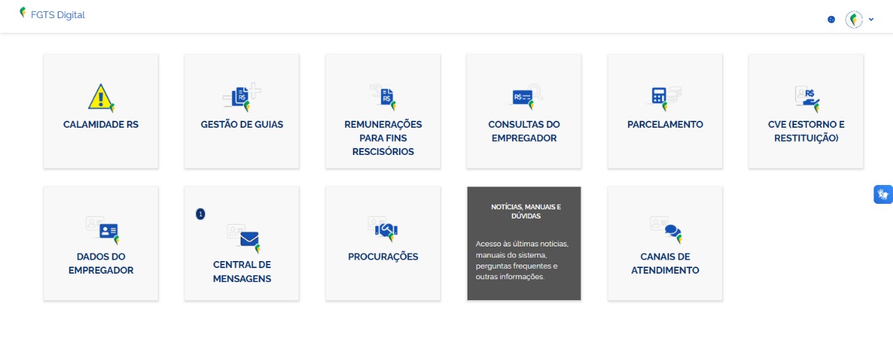 No ambiente do FGTS Digital, o botão “Notícias, Manuais e Dúvidas” funciona como um atalho que direciona o usuário diretamente para a página oficial do FGTS Digital no portal Gov.br.