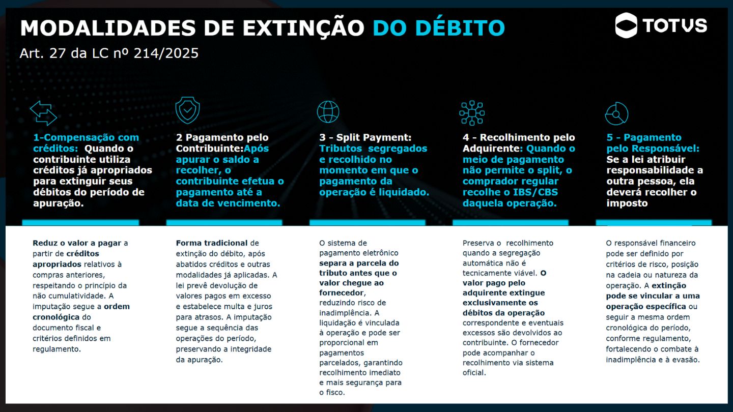 As modalidades de extinção do débito ocupam posição central na sistemática instituída pela Reforma Tributária, pois representam o momento em que a obrigação tributária é definitivamente encerrada. No modelo do IBS e da CBS, estruturado sobre a lógica de débitos e créditos financeiros, é por meio da extinção do débito que se consolida o resultado da apuração periódica. Além de finalizar a exigibilidade do tributo, a extinção funciona como o gatilho jurídico que libera o crédito ao contribuinte: é a partir desse momento que o crédito se estabiliza, torna-se plenamente disponível e pode ser utilizado na compensação de débitos futuros, preservando a coerência da não cumulatividade e garantindo segurança jurídica ao contribuinte. A legislação prevê que os débitos do IBS e da CBS podem ser extintos pelas seguintes modalidades: