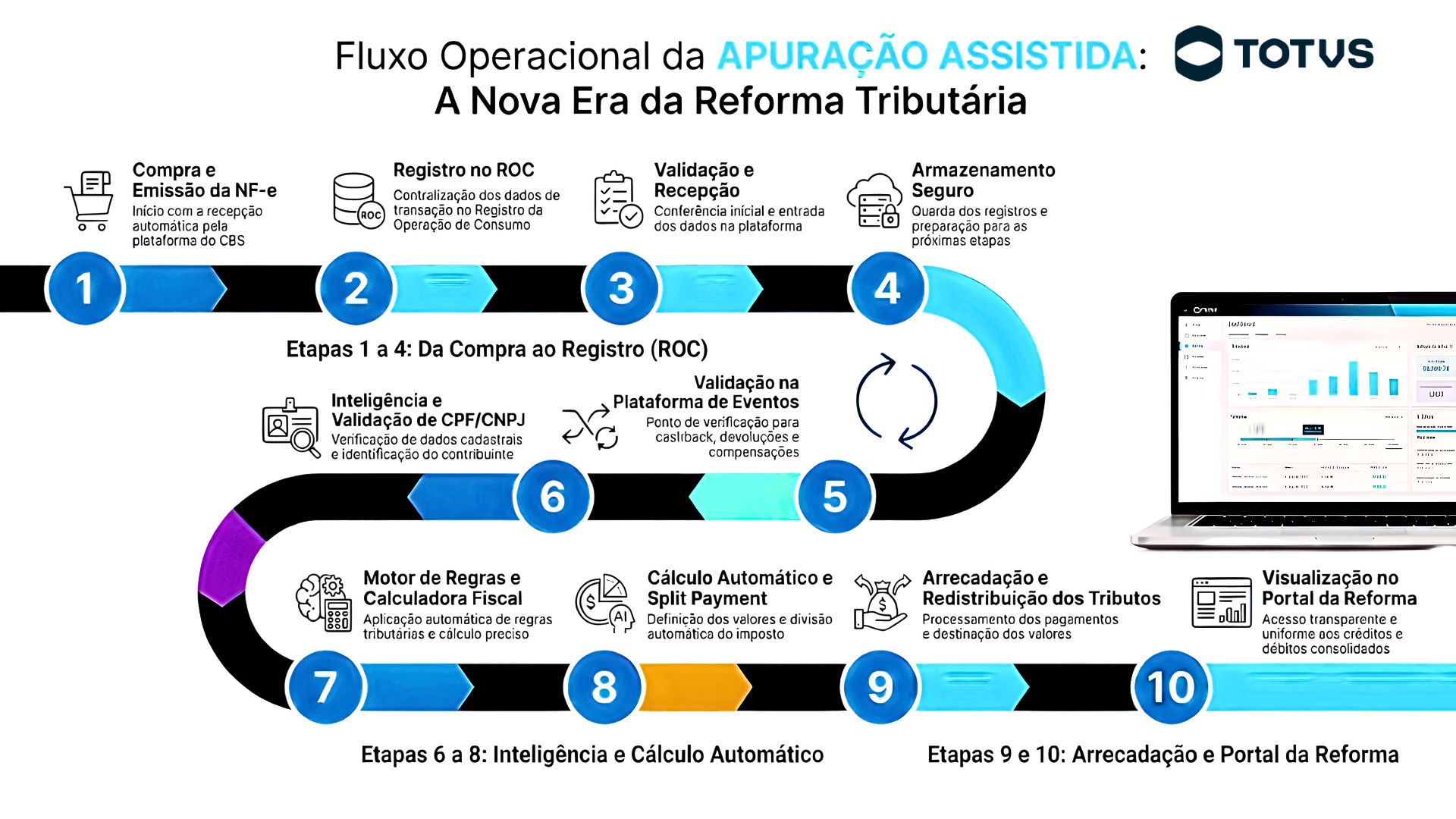 Na apuração assistida, as informações constantes nos documentos fiscais eletrônicos e nos eventos vinculados são processadas em ambiente digital, dentro do chamado Ecossistema da Reforma Tributária, sob a gestão do Comitê Gestor do IBS (CG-IBS) e da Receita Federal do Brasil. A partir desses dados, que ficarão armazenados na Nuvem Soberana do Governo, o sistema consolida automaticamente débitos e créditos e disponibiliza ao contribuinte um cálculo prévio do saldo a pagar ou a recuperar.
