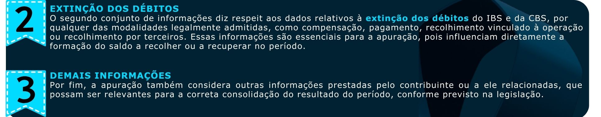 A apuração do IBS e da CBS é realizada de forma consolidada, considerando todas as operações efetuadas por todos os estabelecimentos do contribuinte o saldo do IBS e da CBS apurado em cada período tem como base três grandes conjuntos de informações, que se complementam para formar o resultado final da apuração.