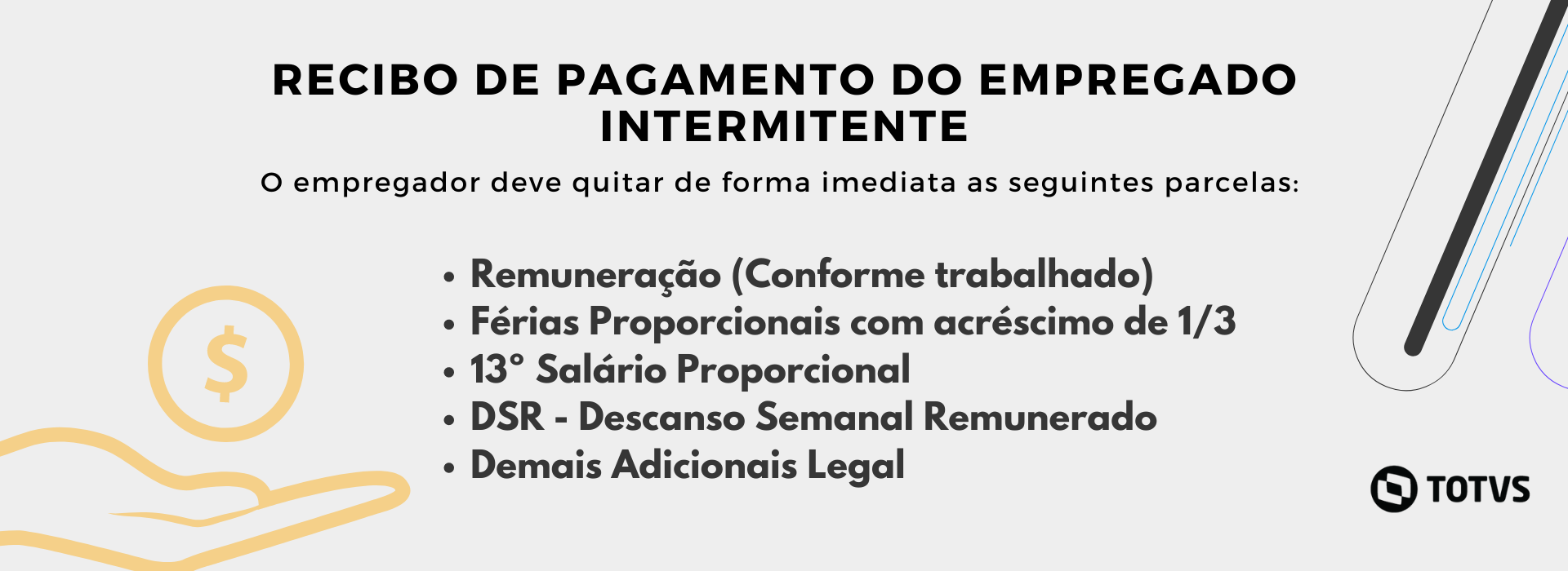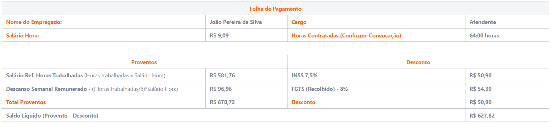 - Salário-Hora: O Salário-Hora é determinado pelo empregador, porém conforme legislação o empregador intermitente não pode receber um salário-hora menor que o salário mínimo ou o salário-hora do mesmo cargo mensal no estabelecimento.